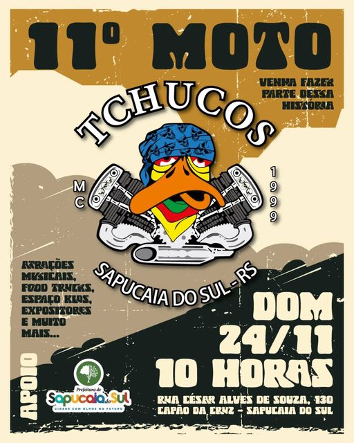 Sapucaia do Sul terá, no dia 24 de novembro, a realização do “11° Encontro de Moto Tchucos Sapucaia do Sul”, às 10h, na Rua César Alves de Souza, n° 130, bairro Capão da Cruz.