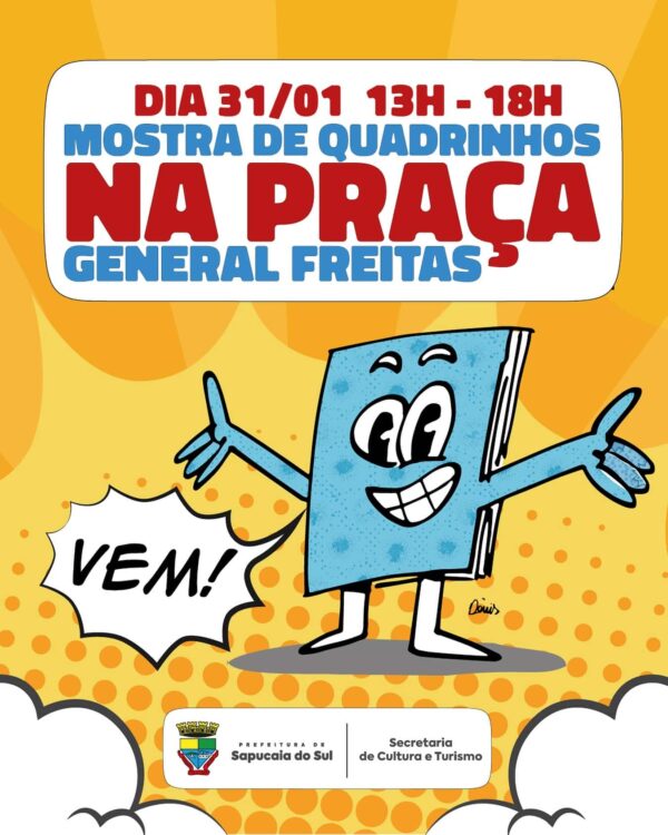 Prepare-se para um evento inesquecível! Em alusão ao Dia Nacional do Quadrinho, a Prefeitura de Sapucaia do Sul, por meio da Secretaria de Cultura e Turismo, convida você para a 1ª Mostra de Quadrinhos municipal de Sapucaia do Sul. Será nesta sexta-feira (31), das 13h às 18h, na Praça General Freitas.