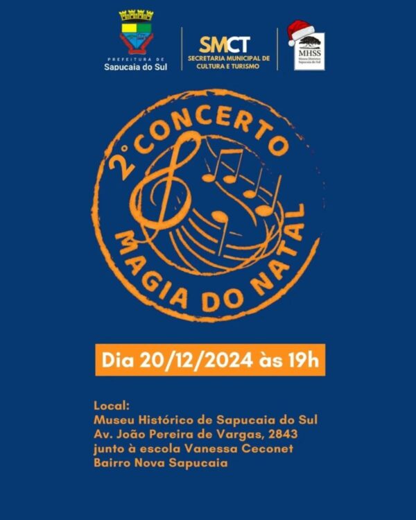 A Prefeitura de Sapucaia do Sul, por meio da Secretaria Municipal de Cultura e Turismo e do Museu Histórico de Sapucaia do Sul, convida você para prestigiar o 2° Concerto Magia do Natal e Uma Noite no Museu.