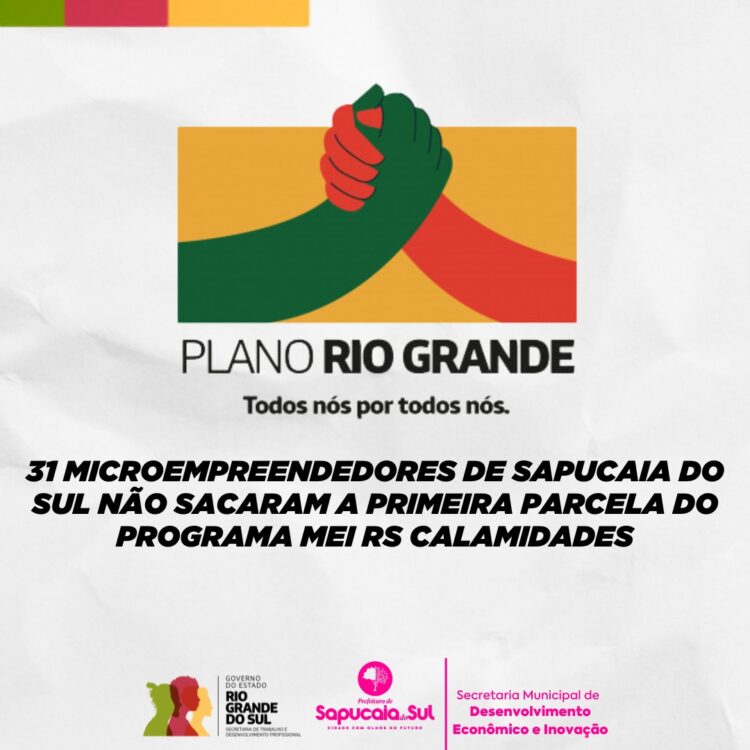 Sapucaia do Sul possui 31 microempreendedores individuais (MEIs) habilitados no MEI RS Calamidades que ainda não sacaram o benefício de R$ 1.500. O valor foi depositado, em julho, diretamente na poupança social da Caixa Econômica Federal de quem atende aos critérios. O programa é uma iniciativa do governo do Estado, por meio da Secretaria de Trabalho e Desenvolvimento Profissional (STDP), e integra o Plano Rio Grande.