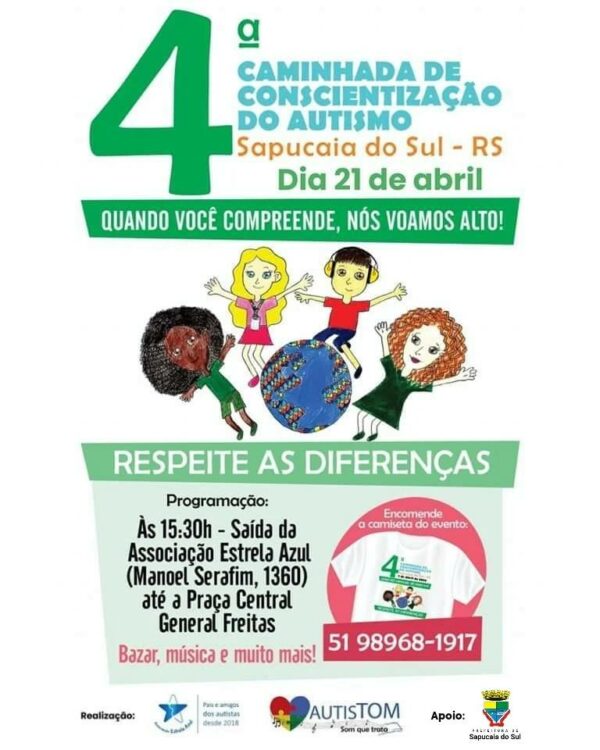 A Prefeitura de Sapucaia do Sul informa que neste domingo, 21 de abril, às 15h30, a Associação Estrela Azul – Pais e Amigos dos Autistas e a Autiston realizarão a 4ª Caminhada de Conscientização do Autismo em Sapucaia do Sul.