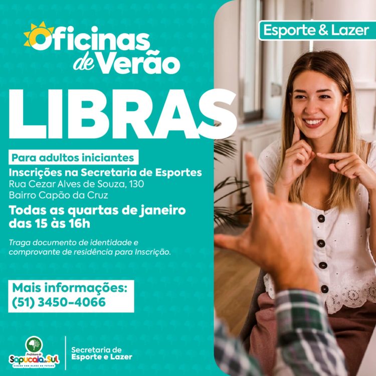 A Prefeitura de Sapucaia do Sul está oferecendo aulas gratuitas de Língua Brasileira de Sinais (Libras) na secretaria de Esporte e Lazer, localizada na Rua Cezar Alves de Souza, número 130, Capão da Cruz.
