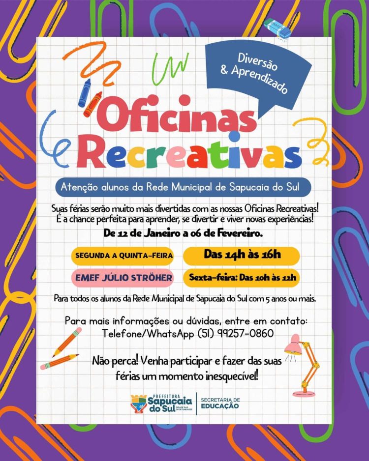 Alunos da rede Municipal de Ensino de Sapucaia do Sul podem se inscrever para participar das Oficinas Recreativas, oportunidade para aprender, se divertir e viver novas experiências.