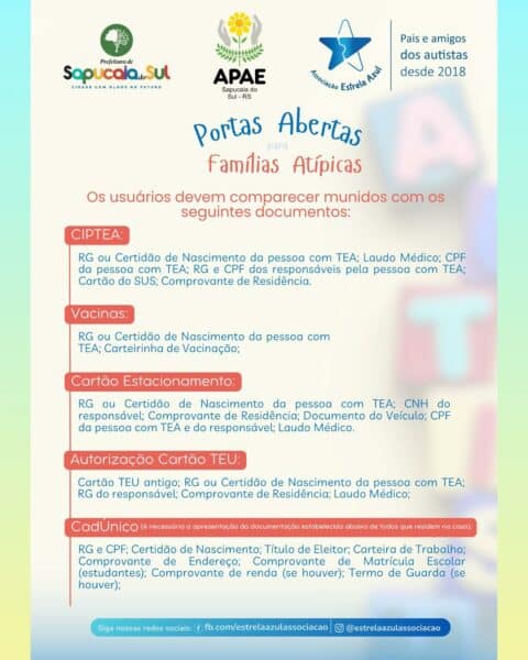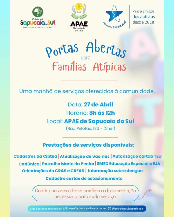 Neste sábado (27), acontece o Apae Portas Abertas. O evento é uma parceria entre a Associação de Pais e Amigos dos Excepcionais de Sapucaia do Sul (Apae), com a Prefeitura Municipal e a Associação Estrela Azul e marca o encerramento do mês de conscientização e promoção de direitos das pessoas com Autismo, sendo aberto a toda comunidade.
