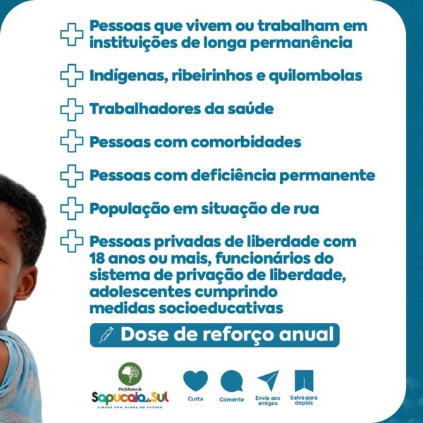 – Para grupos prioritários, como residentes em instituições, indígenas, profissionais de saúde e mais. Garanta sua dose anualmente! Disponível em todas as unidades de saúde.
