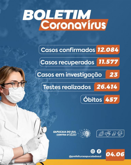 Com isso, o Município soma 12.084 casos confirmados, 11.577 pessoas recuperadas e 457 óbitos ao todo, 39 pessoas estão hospitalizadas e 11 em isolamento domiciliar. Até o momento, foram realizados 26.414 testes, sendo que 14.307 deram negativos e 23 seguem em investigação, aguardando o resultado do exame.