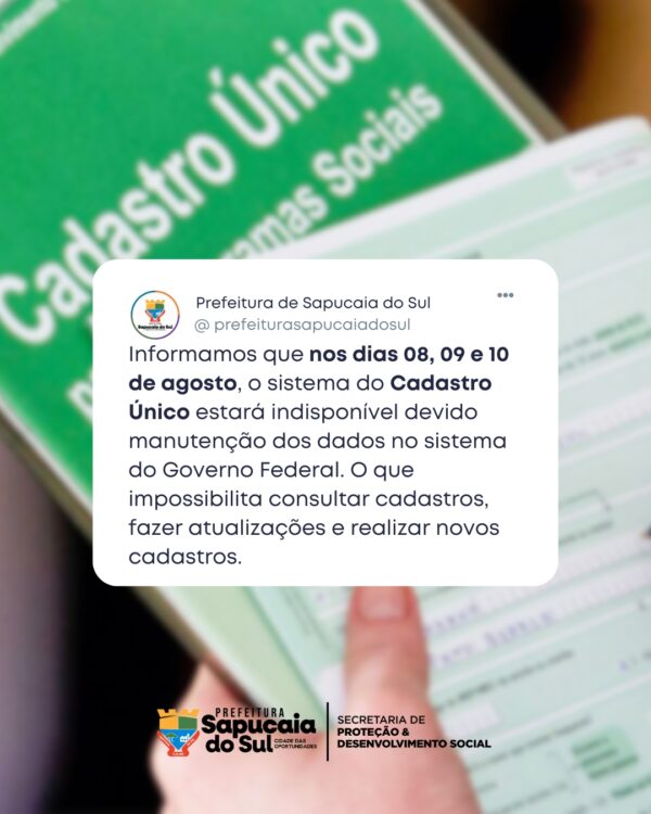 A Prefeitura de Sapucaia do Sul, por meio da Secretaria de Proteção e Desenvolvimento Social, informa que nos dias 08, 09 e 10 de agosto, o setor do Cadastro Único não realizará atendimentos ao público.