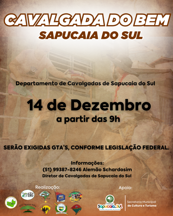 A Cavalgada do Bem tem como objetivo arrecadar alimentos que serão doados às famílias que vivem em situação de vulnerabilidade social. A ação é promovida pelo Departamento de Cavalgadas de Sapucaia do Sul. A saída será às 9h em diferentes pontos:
