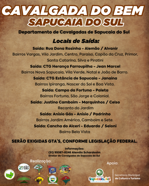 A Cavalgada do Bem tem como objetivo arrecadar alimentos que serão doados às famílias que vivem em situação de vulnerabilidade social. A ação é promovida pelo Departamento de Cavalgadas de Sapucaia do Sul. A saída será às 9h em diferentes pontos: