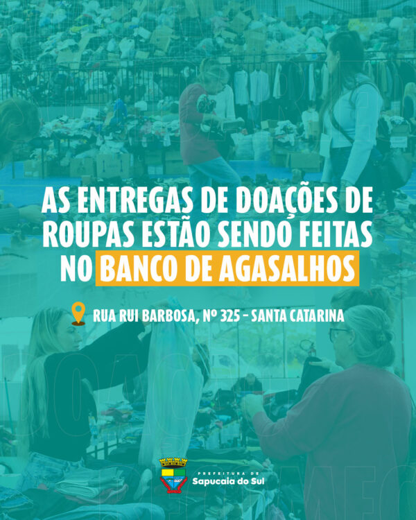 A Prefeitura de Sapucaia do Sul comunica que a entrega de doações está sendo realizada exclusivamente no Banco de Agasalhos.