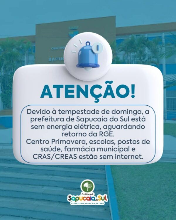 A Prefeitura de Sapucaia do Sul informa que, em decorrência do forte temporal deste final de semana, estamos enfrentando interrupções no fornecimento de energia elétrica nesta segunda-feira.