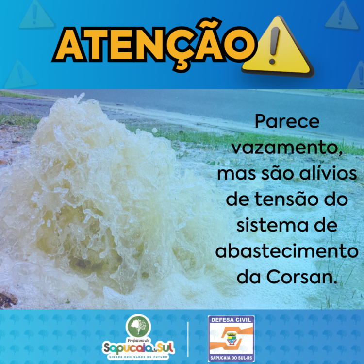 A CORSAN comunica que está realizando em vários pontos do município um procedimento chamado expurgo, que embora pareça um vazamento, trata-se de alívios de tensão para o sistema de abastecimento.