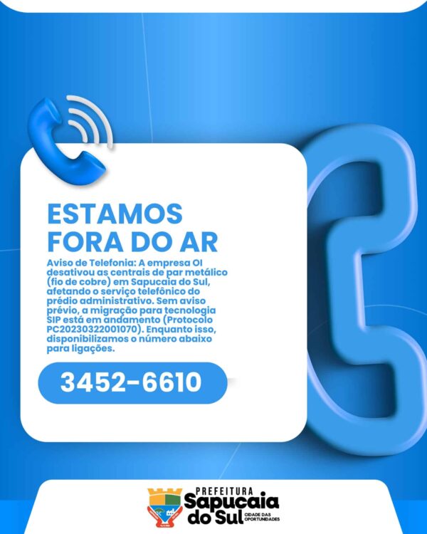 Informamos que, na última sexta-feira, dia 23 de maio, a empresa OI desativou as centrais telefônicas com tecnologia de par metálico (fio de cobre) em Sapucaia do Sul, o que ocasionou a interrupção do serviço de telefonia no prédio administrativo da Prefeitura, sem aviso prévio.