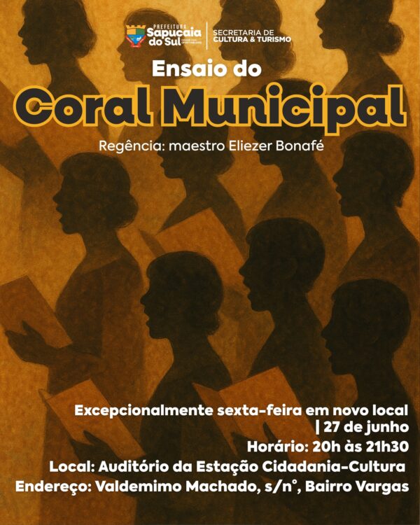A Prefeitura de Sapucaia do Sul, por meio da Secretaria de Cultura e Turismo, convida você para integrar o Coral Municipal! Os ensaios serão conduzidos pelo maestro Eliezer Bonafé e estão abertos para todas as idades a partir dos 10 anos.