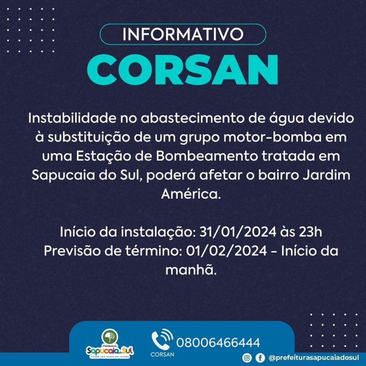 A Corsan emitiu um comunicado na tarde desta quarta-feira (31), informando que será realizado um trabalho de substituição de um grupo motor-bomba em uma Estação de Bombeamento de Água tratada em Sapucaia do Sul. A manutenção, programada para ser realizada a partir das 23h desta quarta-feira, 31, vai beneficiar mais de 12 mil pessoas no município.