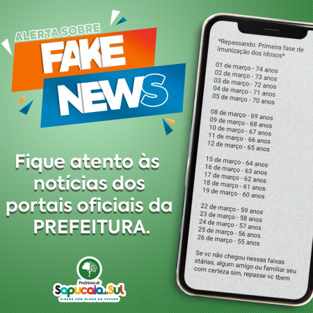 Infelizmente estão circulando notícias falsas sobre o calendário de vacinação em Sapucaia do Sul. Cuidado, as fake news são extremamente perigosas!