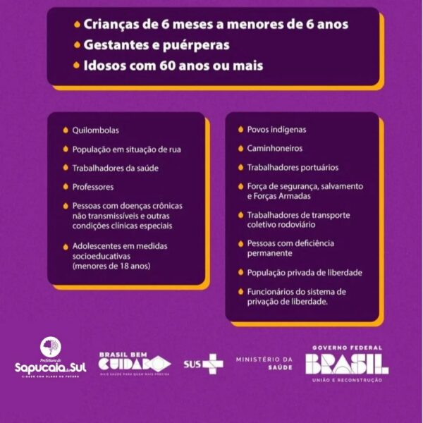 Grupos prioritários, conforme definidos pelo Ministério da Saúde, para receberem o imunizante são: