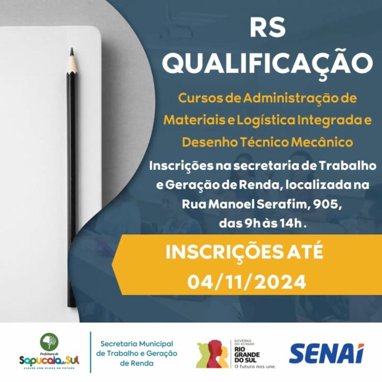 A Prefeitura de Sapucaia do Sul informa que o Programa RS Qualificação, parceria entre o Governo do Estado do Rio Grande do Sul, Prefeitura de Sapucaia do Sul e Senai/RS, disponibilizou 33 vagas para os cursos de Administração de Materiais e Logística Integrada e Desenho Técnico Mecânico, ministrados no SENAI – Sapucaia do Sul.