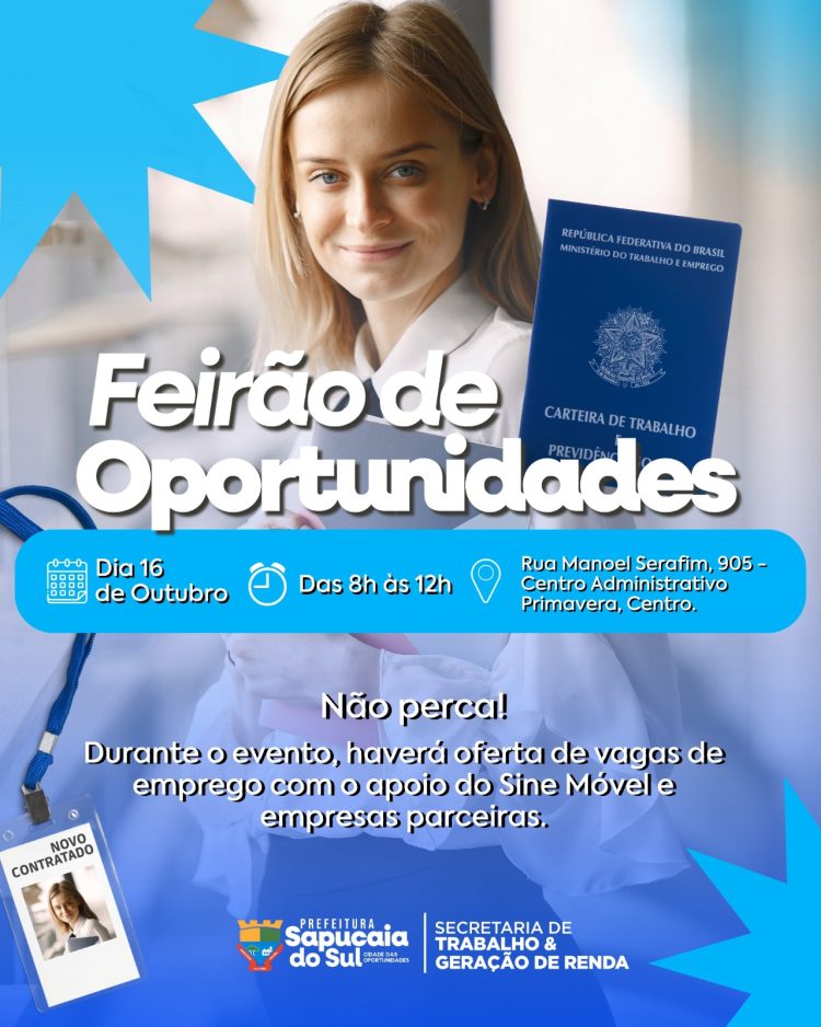 Na próxima quinta-feira (16), Sapucaia do Sul sediará o Feirão de Oportunidades, evento promovido pela Secretaria Municipal de Trabalho e Geração de Renda, em parceria com o Empregar RS.