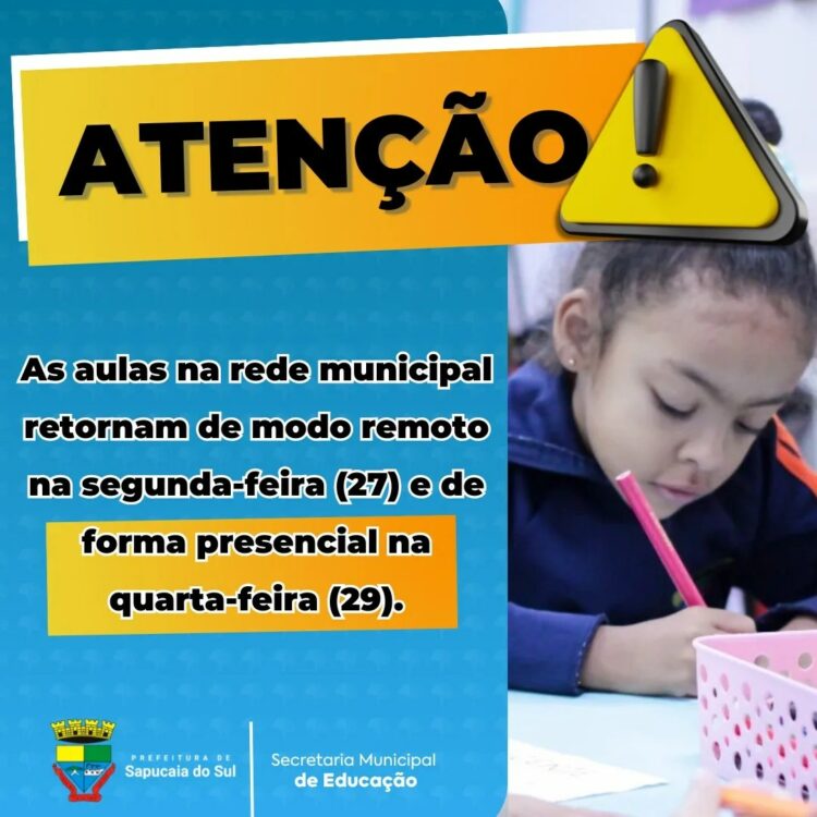 A Prefeitura de Sapucaia do Sul, por meio da secretaria de Educação, comunica que o retorno das aulas nas escolas municipais que ficam nas áreas não atingidas pela enchente e que não estão sendo utilizadas como abrigo, estão previstas para a segunda-feira, dia 27 de maio, de forma remota, e na quarta-feira, dia 29 de maio, de forma presencial.