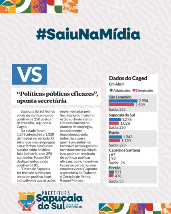 Sapucaia do Sul encerrou abril com um saldo positivo de 250 postos de trabalho, de acordo com os dados do Cadastro Geral de Empregados e Desempregados (Caged). Foram registradas 1.278 admissões no periodo.