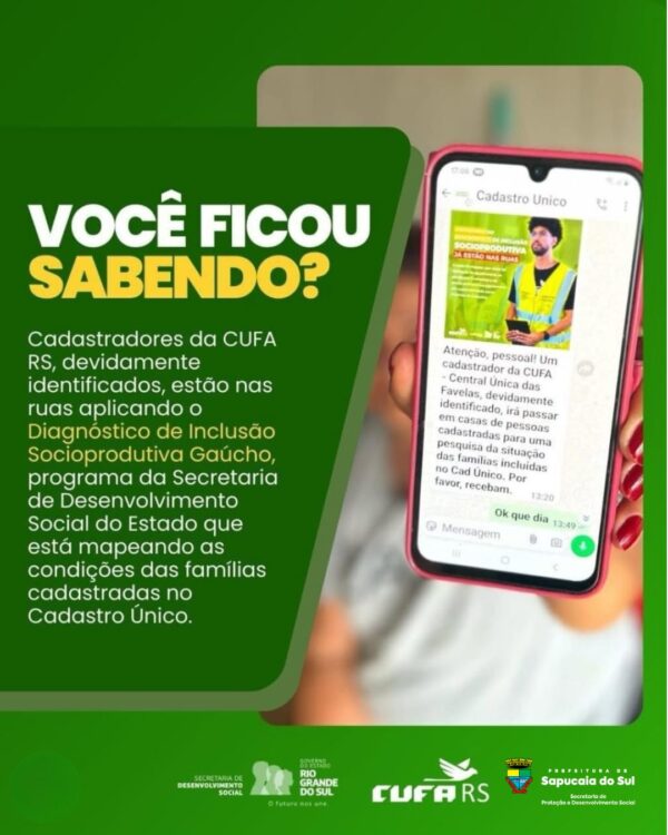 A pesquisa Diagnóstico de Inclusão Socioprodutiva Gaúcho está sendo realizada em Sapucaia do Sul para mapear a situação socioeconômica de famílias inscritas no CadÚnico.