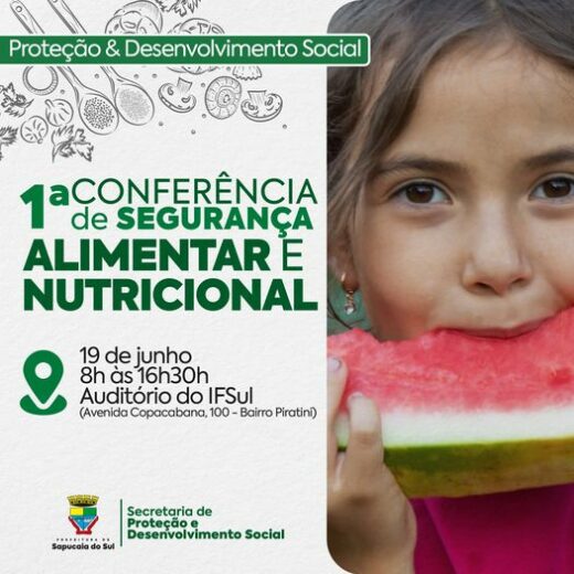 A Prefeitura de Sapucaia do Sul, através da secretaria de Proteção e Desenvolvimento Social, promove a 1º Conferência Municipal de Segurança Alimentar e Nutricional de Sapucaia Do Sul.