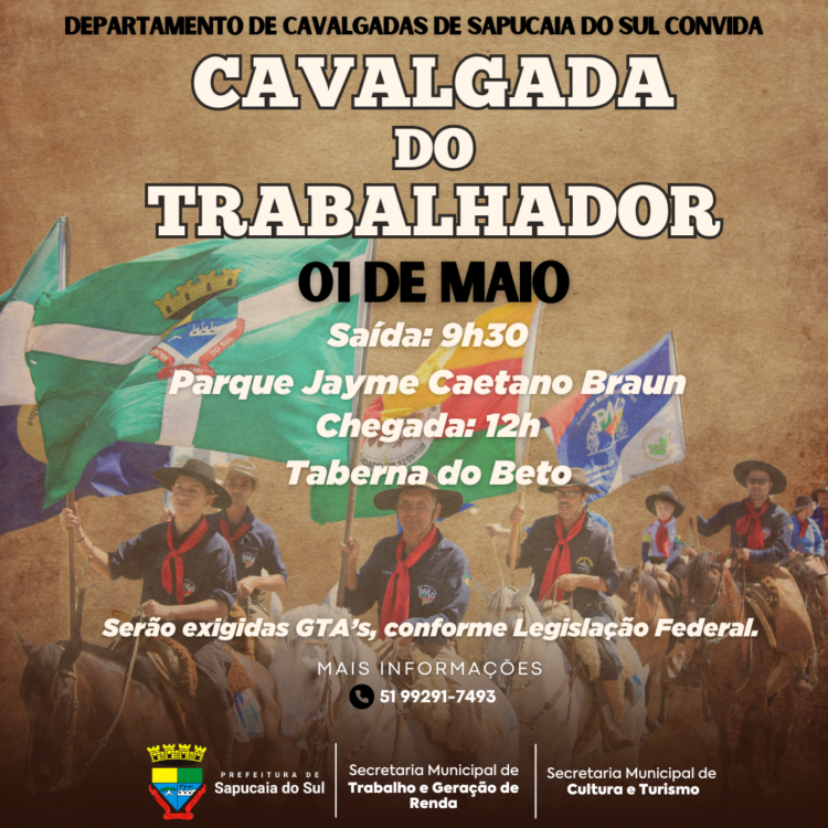 Será dia 01 de maio (quarta-feira), com concentração a partir das 9h e saída às 9h30 do Parque Jayme Caetano Braun, onde cavaleiros e cavaleiras do município realizarão uma cavalgada até a Taberna do Beto.