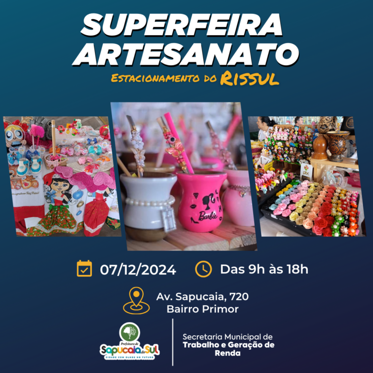 Nesse sábado (07), ocorrerá mais uma edição da Feira de Empreendedorismo e Economia Solidária do município. O evento será realizado no estacionamento do Rissul, localizado na Av. Sapucaia, 720.
