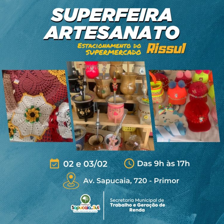 A Prefeitura de Sapucaia do Sul, por meio da secretaria de Trabalho e Geração de Renda, realizará nesta sexta-feira (02) e sábado (03), das 09h às 17h, mais uma edição da “SUPERFEIRA DE ARTESANATO”.