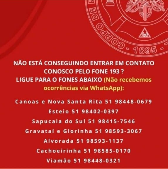 Os Bombeiros de Sapucaia do Sul informam que, caso haja dificuldade de entrar em contato com a corporação pelo telefone 193, pode ser usado o número 51 98415-7546 para ligações. O número não aceita mensagens de WhatsApp.